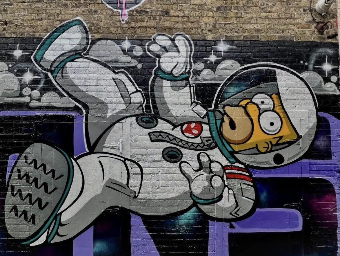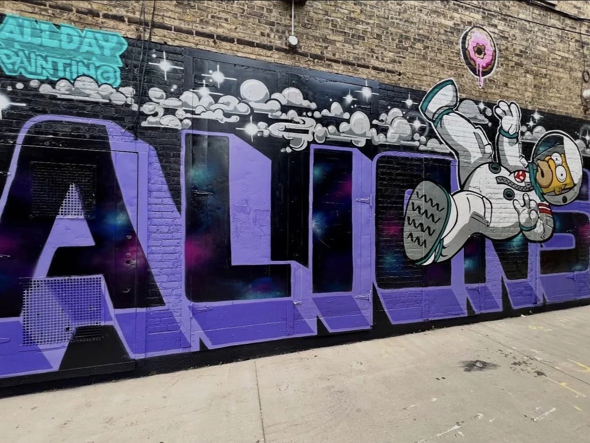 In “Dedication,” ALLDAY PAINTING blends humor, nostalgia, and sci-fi surrealism into a bold, unforgettable mural. The piece features Homer Simpson floating in space, outfitted in an astronaut suit and reaching, ever so helplessly, for a pink sprinkle donut just beyond his grasp. Behind him, the massive word ALIENS stretches across the wall in stylized black and purple lettering, with soft clouds hovering just above.