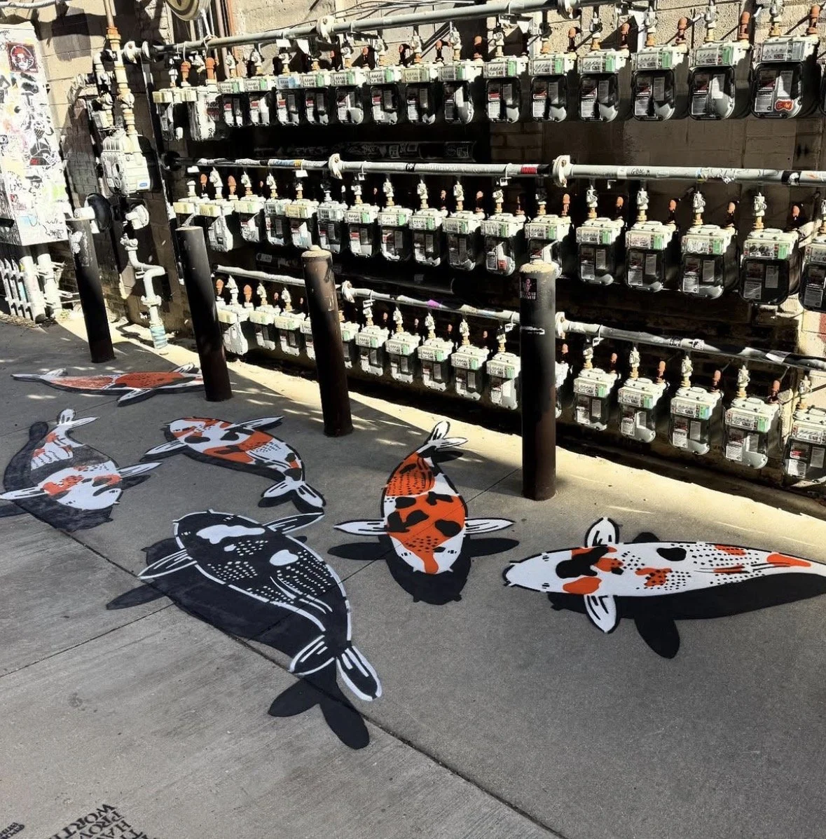 Novy played a foundational role in Black Cat Alley’s beginnings: his Monarch Butterflies mural was the first official mural installed inside the alley in 2016. His koi series, including the “Koi” ground mural, is among his most recognized bodies of work, referencing coded anti-authoritarian symbols in Chinese art while also evoking themes of survival, persistence, and transformation.